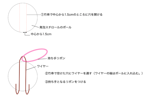 次回は発泡スチロールの球に持ち手をつけた後に、つまみ細工の花を接着して組み立てます。いよいよラストパートです。